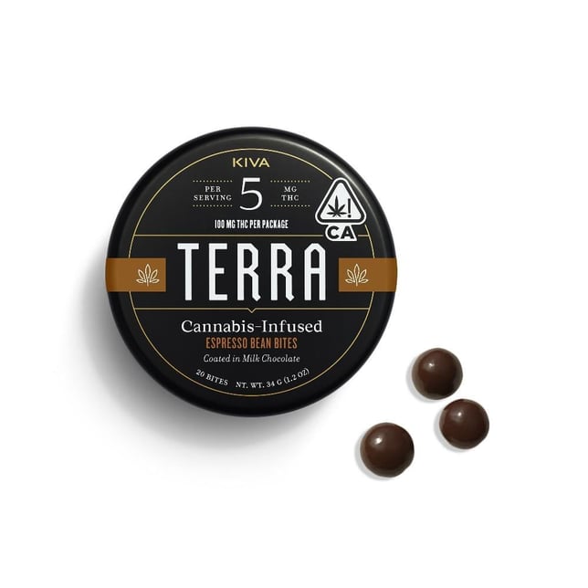 KIVA Chocolate covered espresso beans Terra Bites are crafted from micro-roasted Tanzanian coffee beans and coated in Kiva Dark Chocolate.Doses: 20 Dosage: 5.0mg
