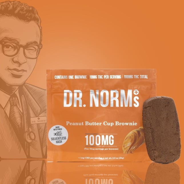 Dr. Norm's Peanut Butter Solventless Hash Brownie is loaded with delicious peanut butter cups, peanut butter chips, and decadent chocolate! It is powered by Punch Extracts HASH and is the first solventless baked good in CA! It is great for low, medium, and high tolerance patients as it is a 100mg bar that comes with a dosing guide for how to cut into ten 10mg pieces.