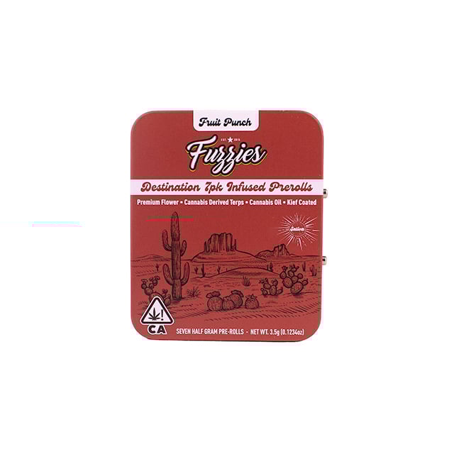 Set out on a California adventure with our Fuzzies Destination 7-Pack prerolls. Each sleek tin contains seven handcrafted .5G prerolls, made from single-source whole nug flower, infused with premium cannabis oil, and coated in golden kief. With a total of 3.5G, this pack is your passport to exploring the coast, desert, and forests—one perfect puff at a time.