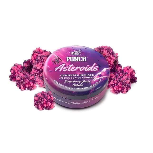 An Industry First- Punch Asteroids. Pebble Coated Gummies with an extraordinary fusion of flavor and potency. Elevate your edible experience to stellar heights!