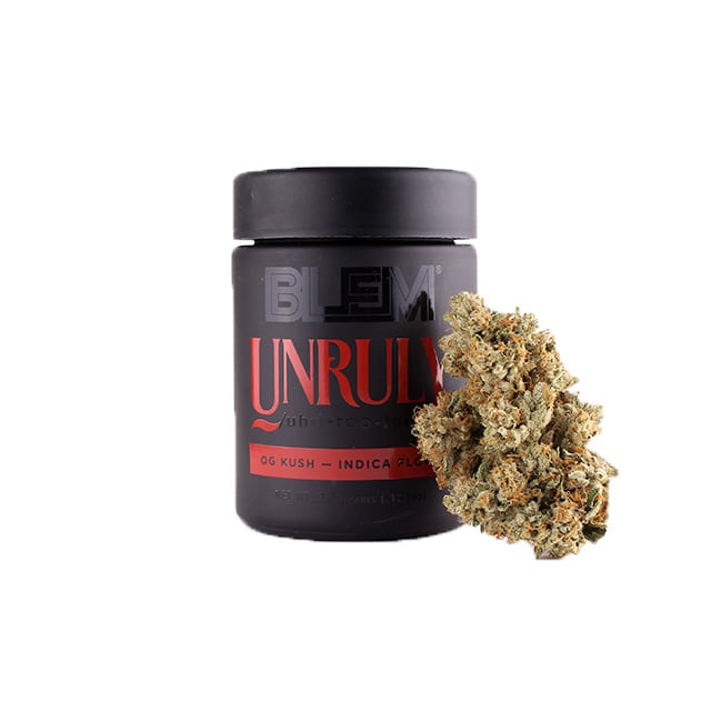 UNRULY \uhn-roo-lee\ - OG KUSH INDICA – slang for rebellious Unruly is a hard hitting California strain known for its incredible stress-relieving qualities and ability to uplift the smokers mood. It is great for treating chronic pain, depression, and anxiety. This strain has a citrusy and musty aroma and a flavor of fuel, skunk, and pine. This flower will have the worries of your day melting away with its noticeably high THC content