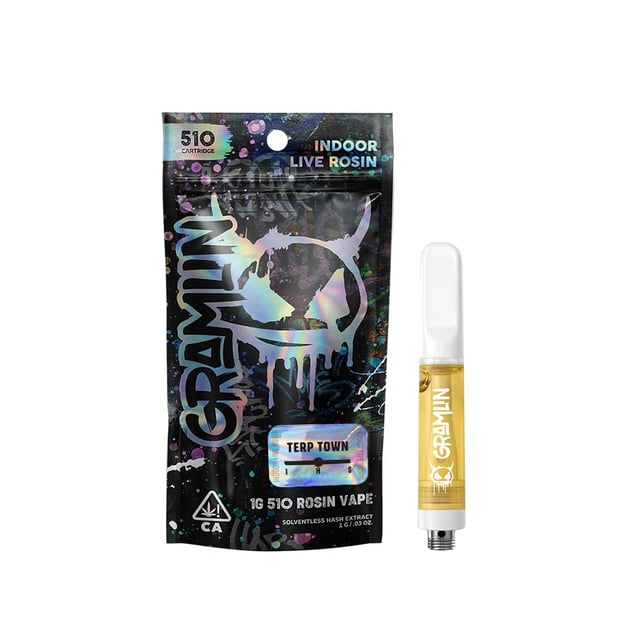 Gramlin 510 Rosin carts are fire in, fire out at its finest. Terp Town’s profile blends Creamy Fruit and Earthy Pepper by crossing Wedding Pie x Birthday Cake for the perfect combo to elevate your day. Taste the terps with a fully ceramic system designed to protect each strain’s unique terp profile. Our solventless rosin is pressed from ice water hash that’s extracted from fresh-frozen indoor flower straight out of our grow. We are the growers. We are the processors. We control the run from seed to press to put fire flavor in every cart.