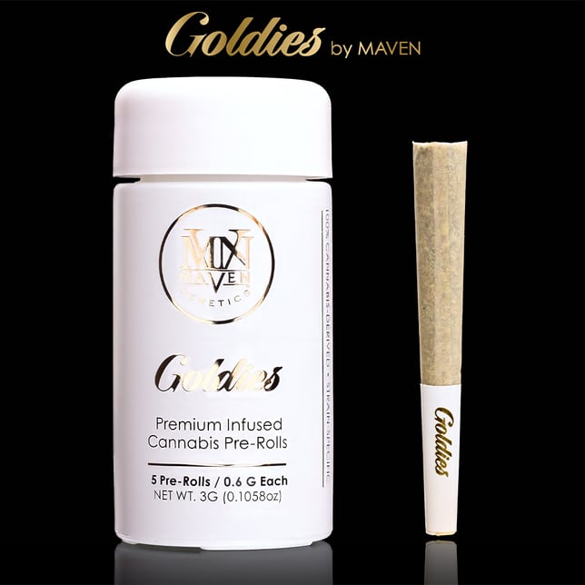 Goldies are Maven’s premium infused cannabis pre-rolls — crafted with award-winning indoor flower, ultra-refined cannabis oil, and strain-specific kief and terpenes. Each 5-pack contains five 0.6g joints made exclusively from Orange Bellini, ensuring a smooth, strain-authentic infusion with elevated potency.