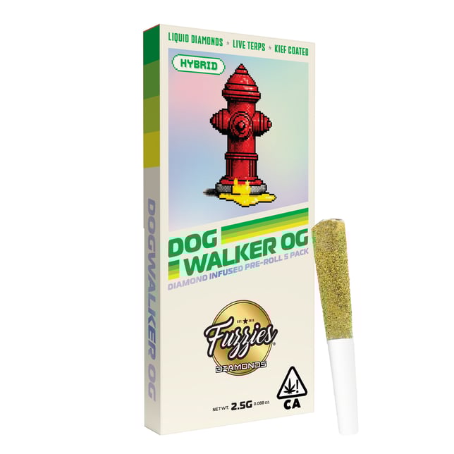 Dogwalker OG takes you on a steady stroll with earthy, woody flavor and a mellow, full-body high. Infused with liquid diamond oil and coated in golden kief, these pre-rolls are smooth, potent, and built for kicking back. Dogwalker OG is your retro reset button.