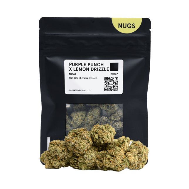 Purple Punch x Lemon Drizzle is an indica that combines dark, syrupy fruit with sharp citrus brightness for a bold, contrasting profile. The aroma opens with overripe plum, sugary lemon glaze, and a hint of earthy spice. The flavor delivers rich grape, tart lemon curd, and a slightly doughy finish that coats the palate on the exhale.